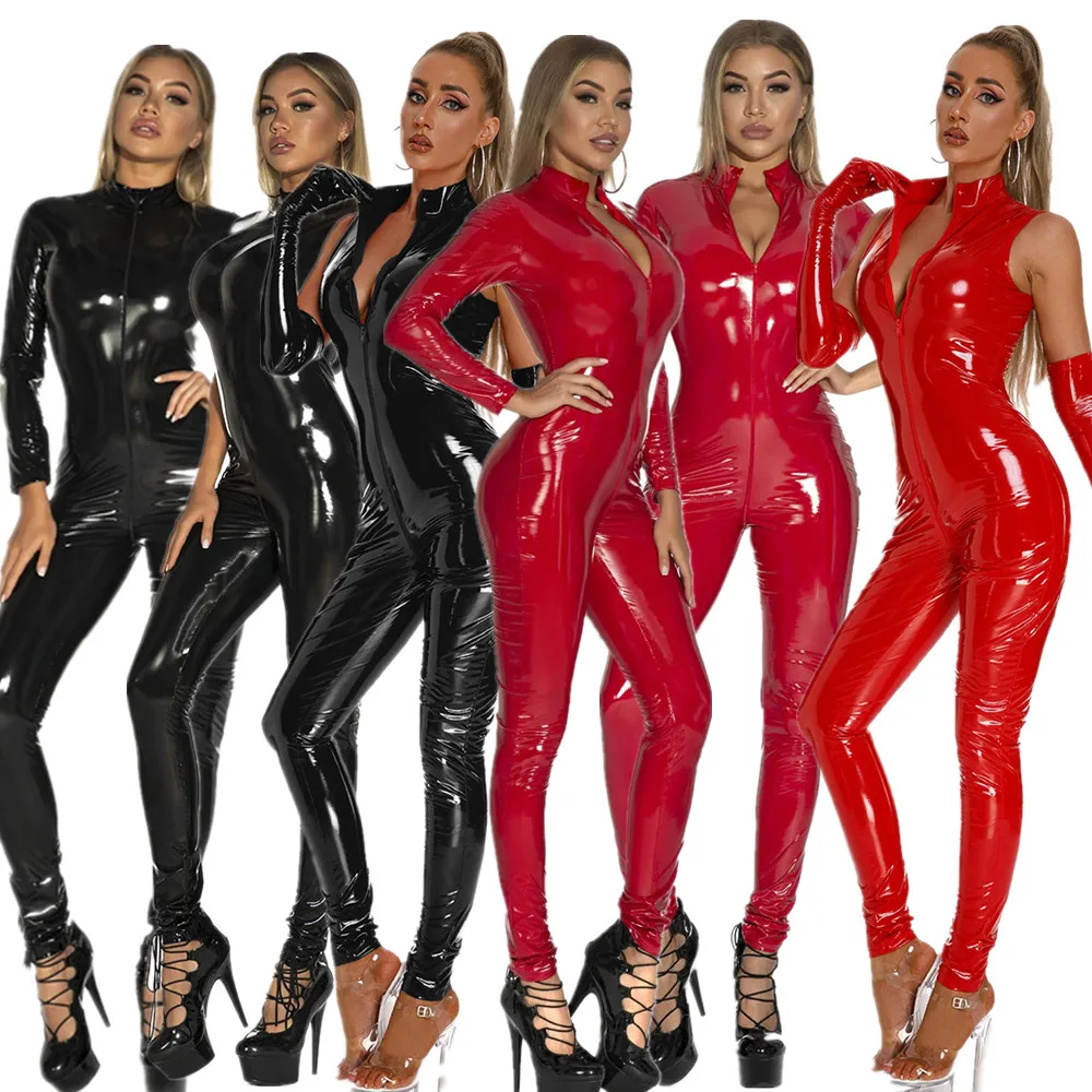 Sexy Wetlook PVC Zipper Open Crotch Bodysuit Shiny Leather Catsuit Faux Jumpsuit Nightclub Pole Dance PU Cosplay Jumpsuit 5XL
