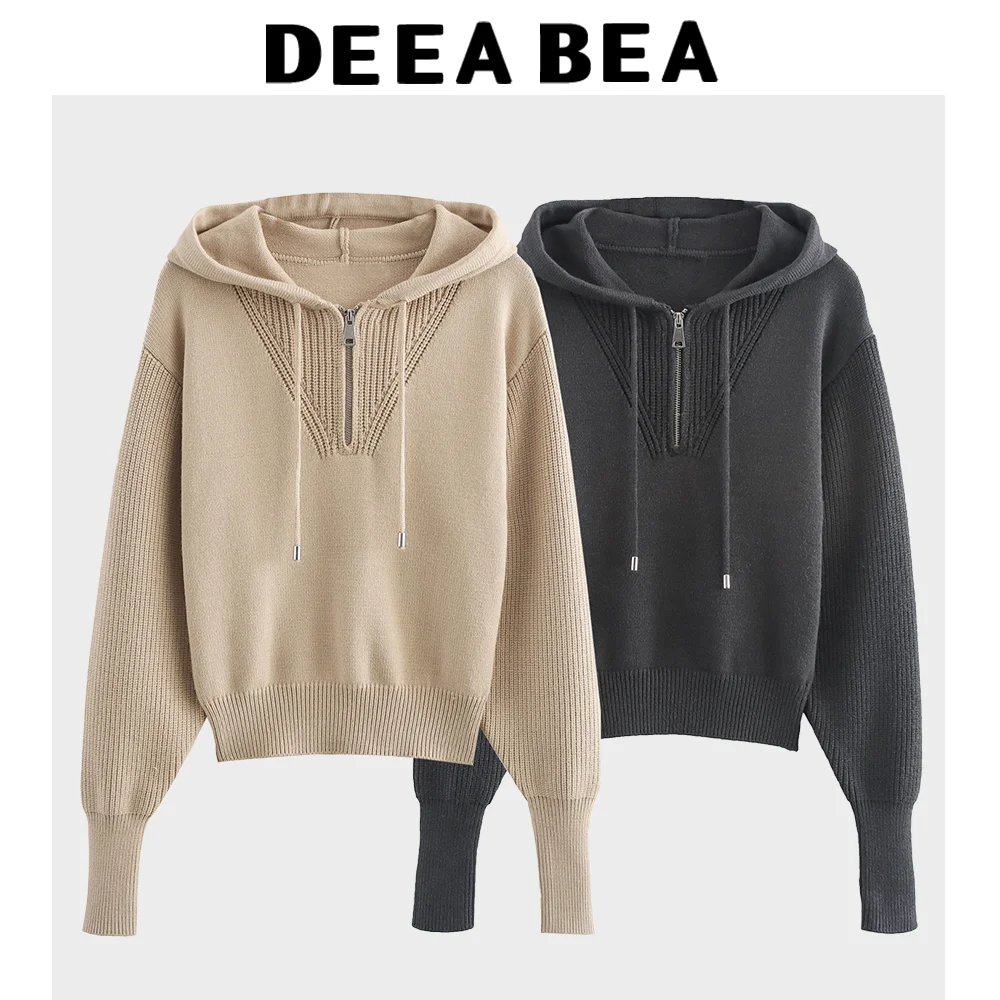 Sweet Fashionable Ribbed Drawstring Zippered Hooded Knitted Sweater Warm Comfortable Versatile Stylish Graceful