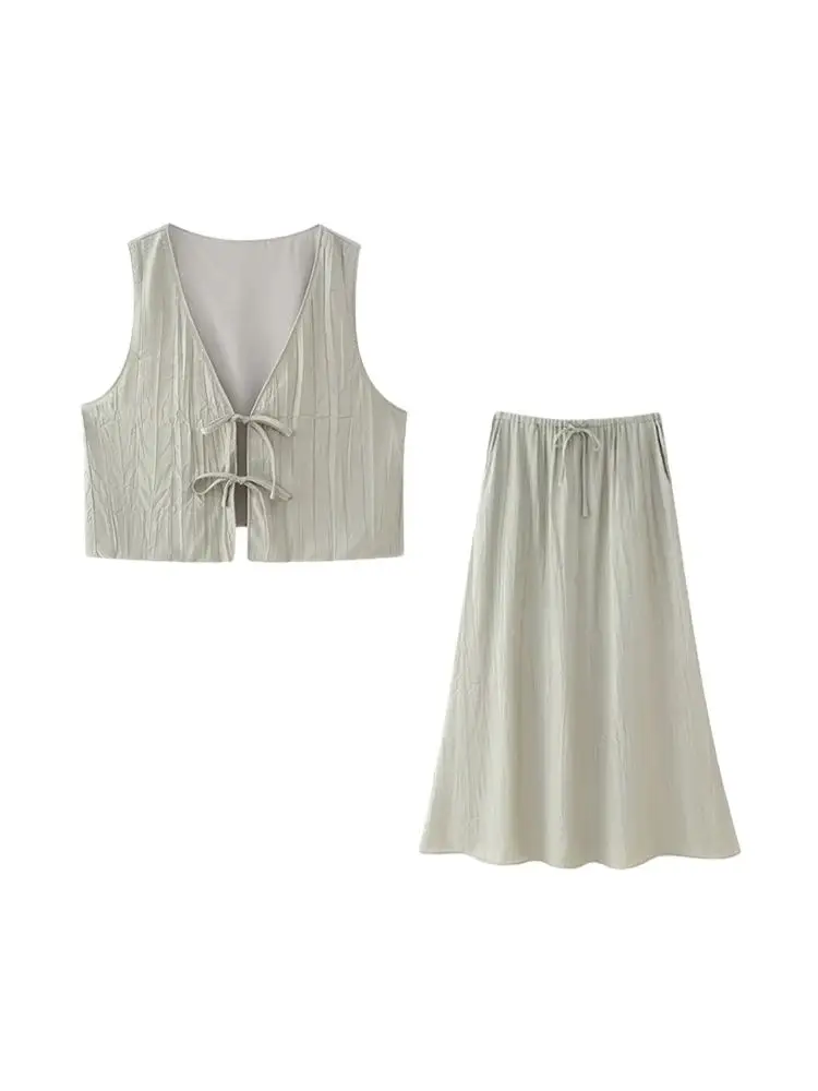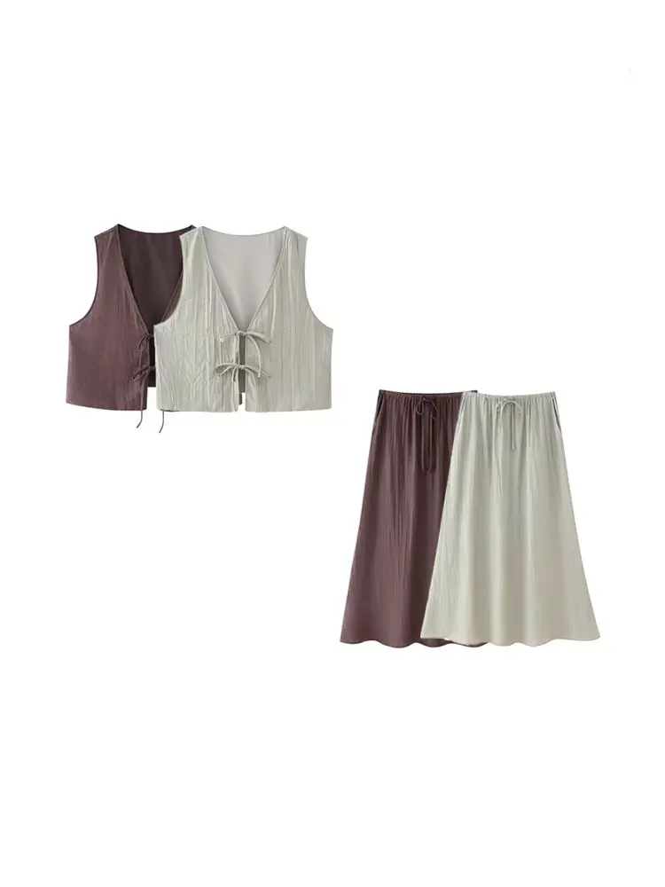 TRZA Women Fashion Cropped Textured Waistcoat And High Elastic Waist Midi Skirt Female Two Piece Sets Mujer