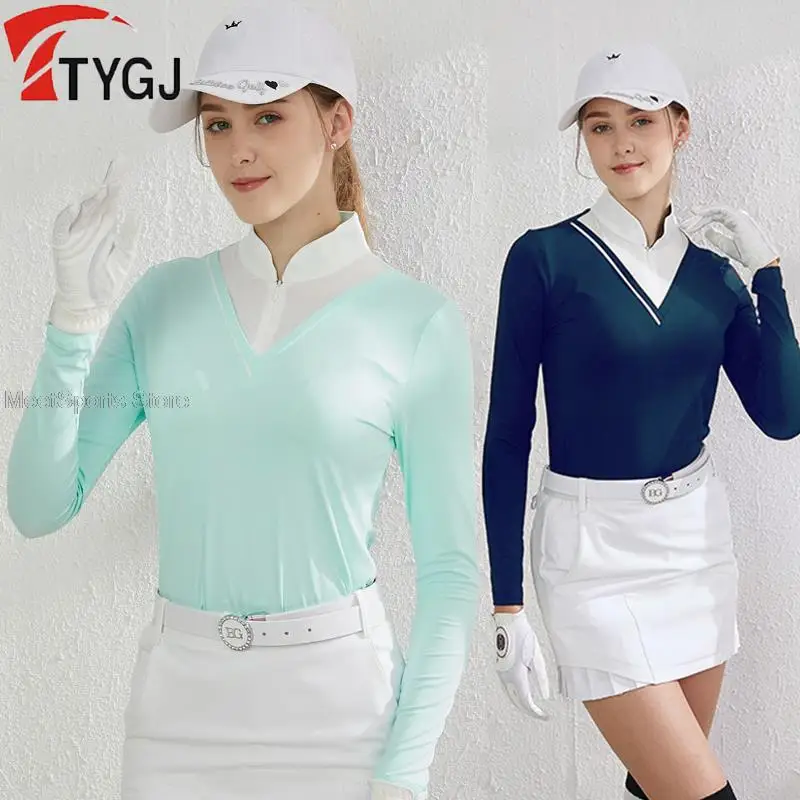 Ttygj Golf Clothes Women’S Long-Sleeved Sunscreen Ice Silk Tops Ladies Zipper Collar Bottoming T-Shirt Cooling Sportswear