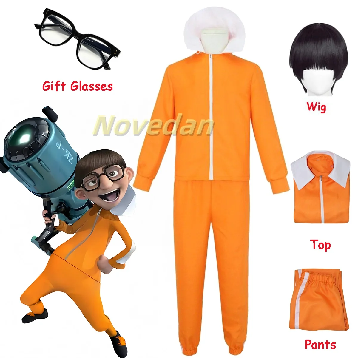 Vector Cosplay Uniform Orange Jakect Pant Glasses Outfit Set Mushroom Wig Halloween Party Fancy Suit Movie Anime Costume Men