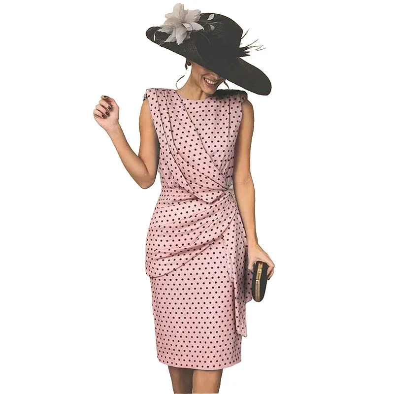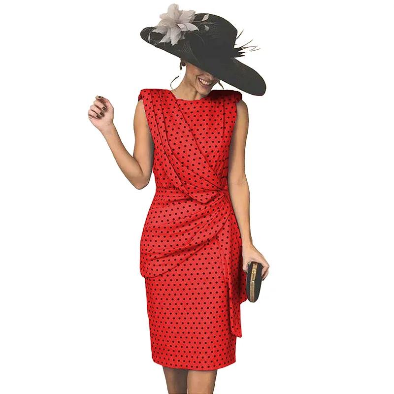 Vintage Dot Lace Up Dresses Sleeveless Women Printed O-Neck Fashion Slim Dress Office Lady Casual Spring Summer Streetwear