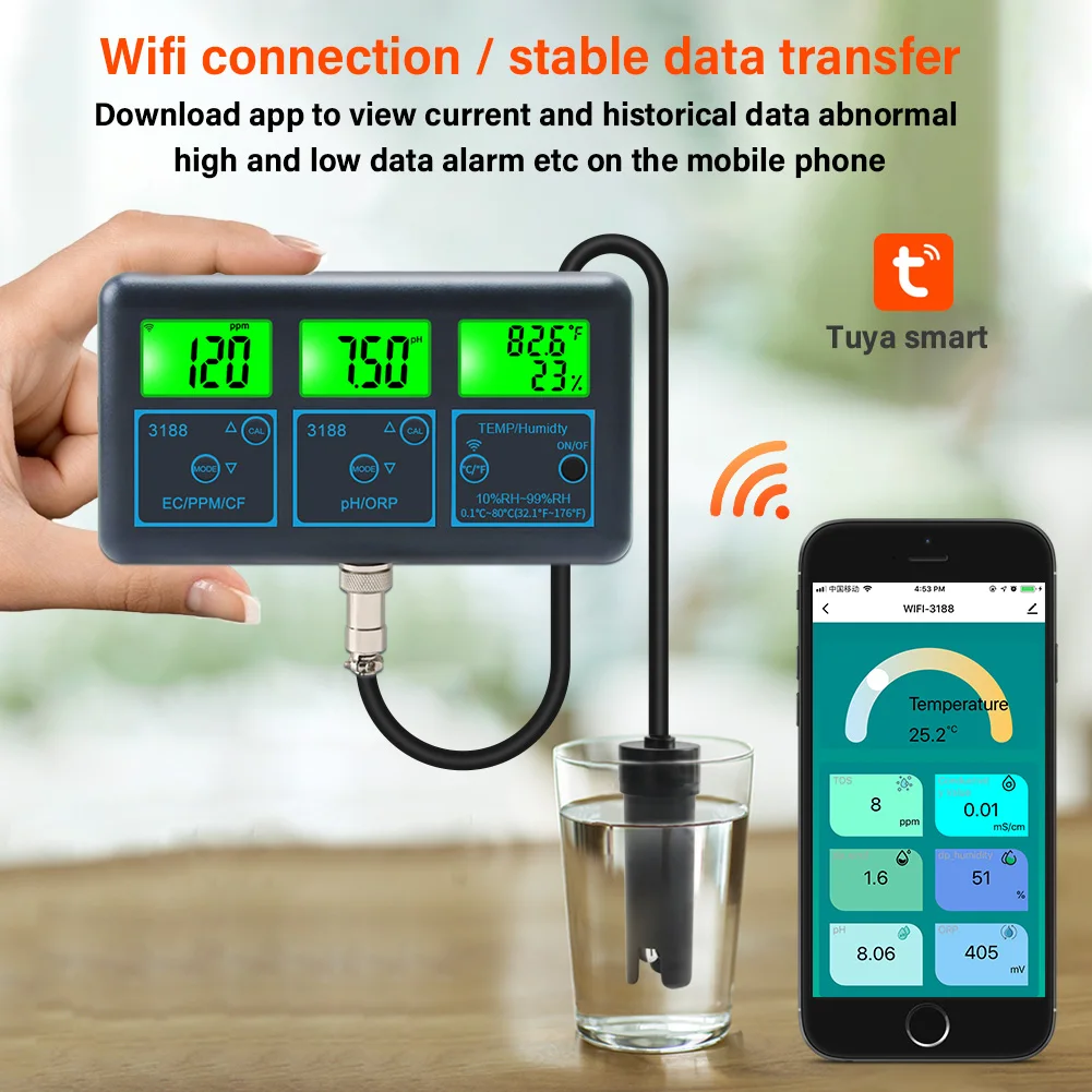 WiFi PH Meter Temp TDS(ppm) EC ORP Water Tester Tuya APP Smart Monitor Digital Analyzer for Aquariums Hydroponics Swimming Pool