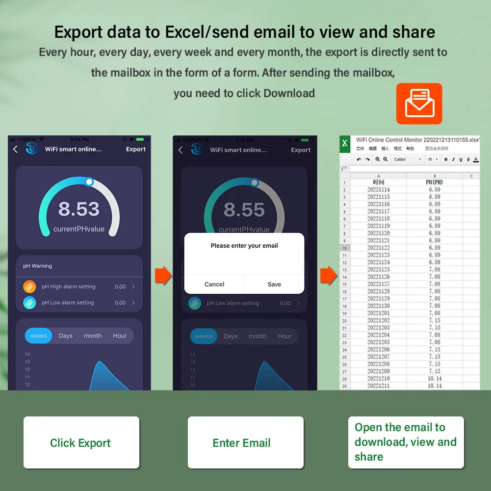 【Data Logger】data automatically stored and saved after 30 days. Data is received at all times; a set of data is transmitted in 15 seconds; data curve graphs is provided analysis. You can receive excel file in your phone or PC.