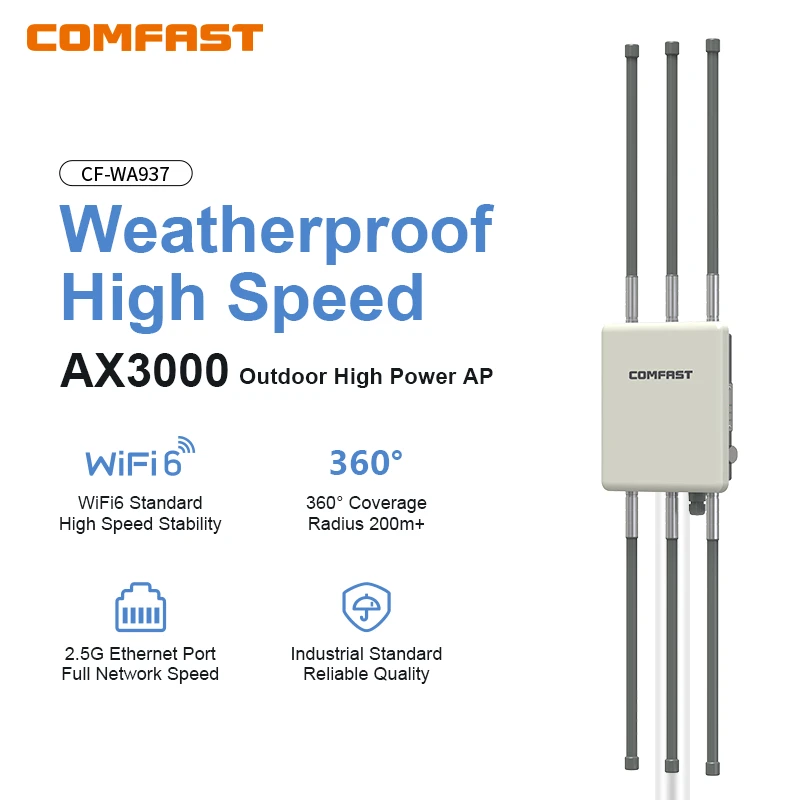 CF-WA937 is a high-power outdoor AP product upgraded to the WiFi 6 luxury high-end version. The product adopts a brand three core CPU solution, supports 2.4GHz&5.8GHz dual band, and has a maximum wireless speed of 2974Mbps. The ultra luxurious configuration and excellent performance make it highly suitable for large outdoor venues