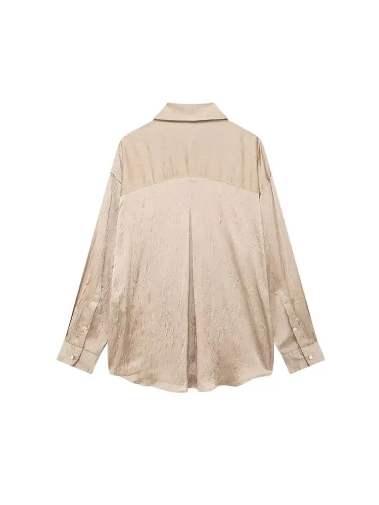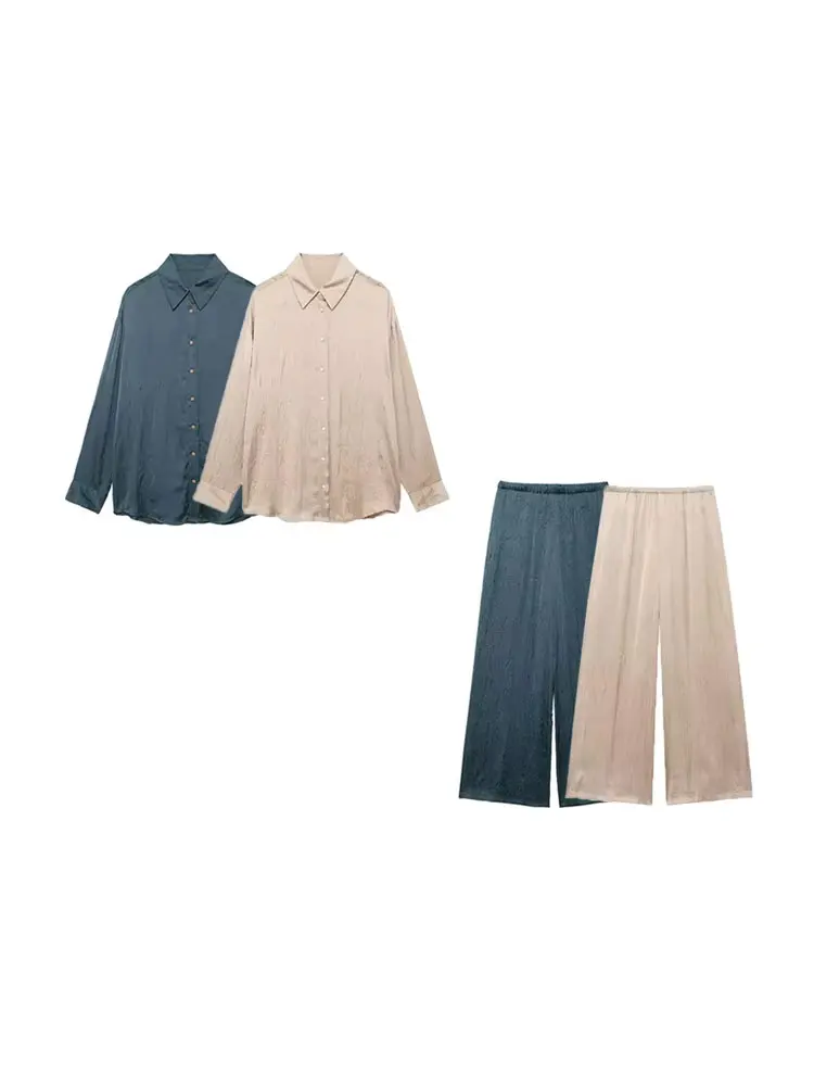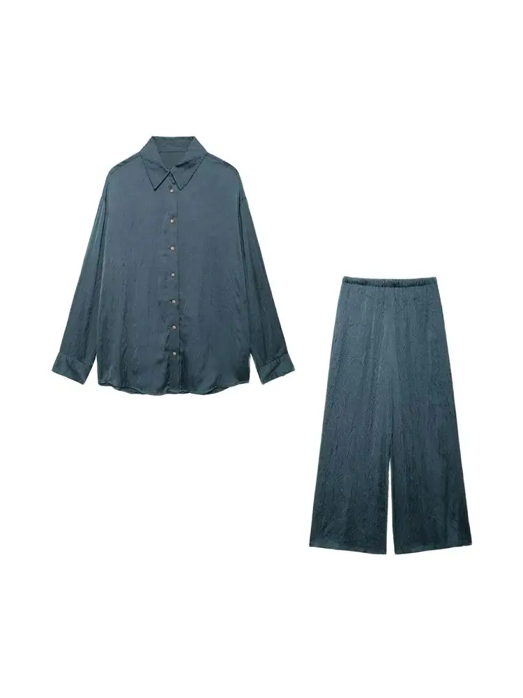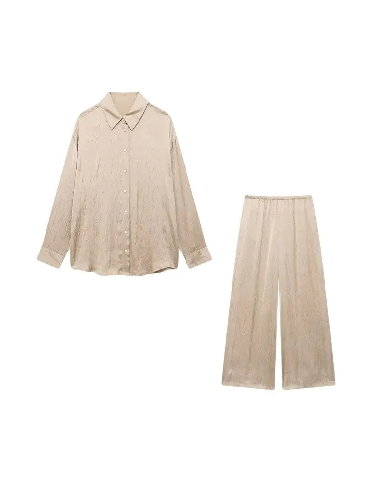 Women Fashion Creased-effect Satin Shirts And High Elastic Waist Wide Leg Pants Female Two Piece Sets Mujer