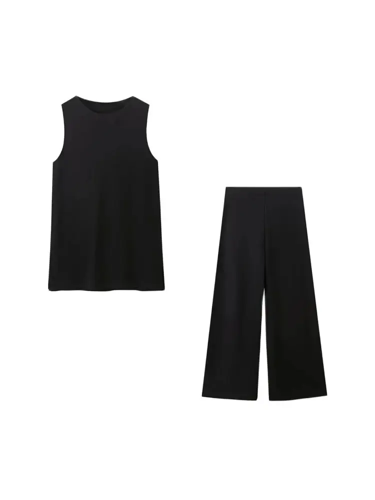 Women Fashion Side Vents Sleeveless Soft Tank Tops High Elastic Waist Wide Leg Pants Female Two Piece Sets Mujer