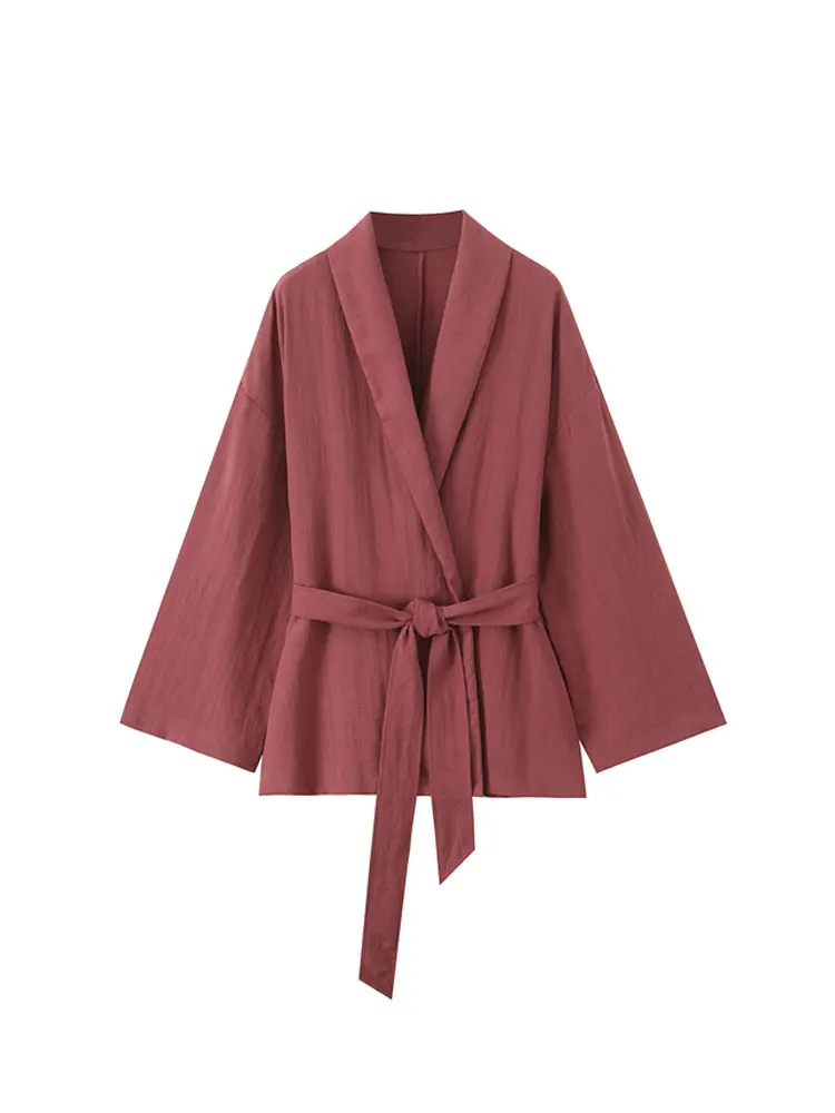 Women Fashion With Belt Kimono Jacket And Midi Elastic Waist Side Pockets Trousers Female Two Piece Sets Mujer