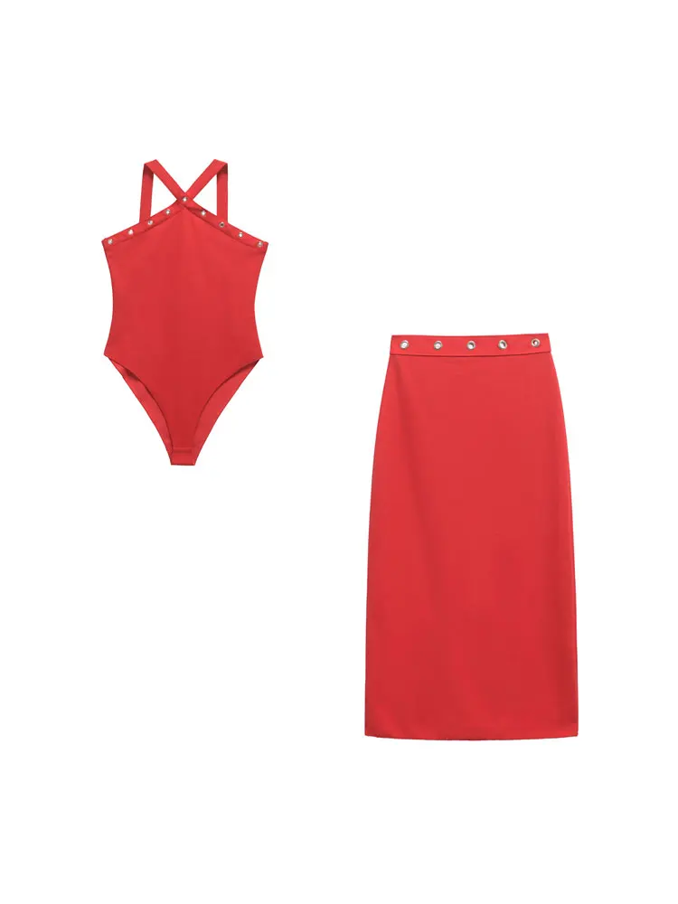 Women Fashion With Eeyelet Stretch Bodysuit And Mid-rise Waist Back Vent Midi Skirt Female Two Piece Sets Mujer