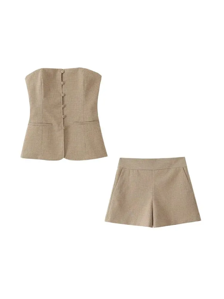 Women Sexy Plaid Strapless Bustier Top And High Waist Side Zipper Shorts Two Piece Set Fashion Female Outfit