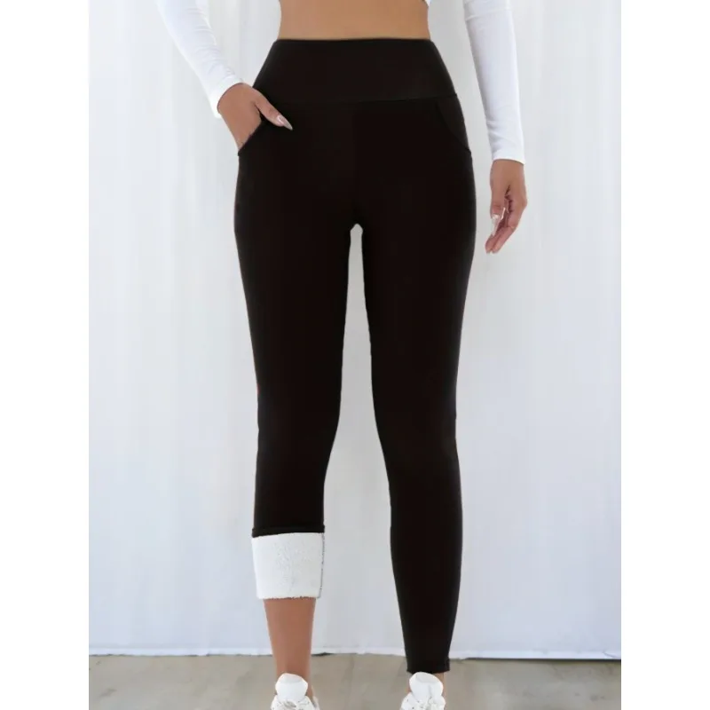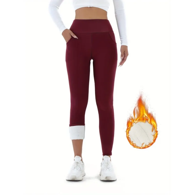 Women Winter Thicken Fleece Lined Leggings With Pockets High Waist Elastic Cozy Warm Tights Pants Slim Velvet Leggings Pants