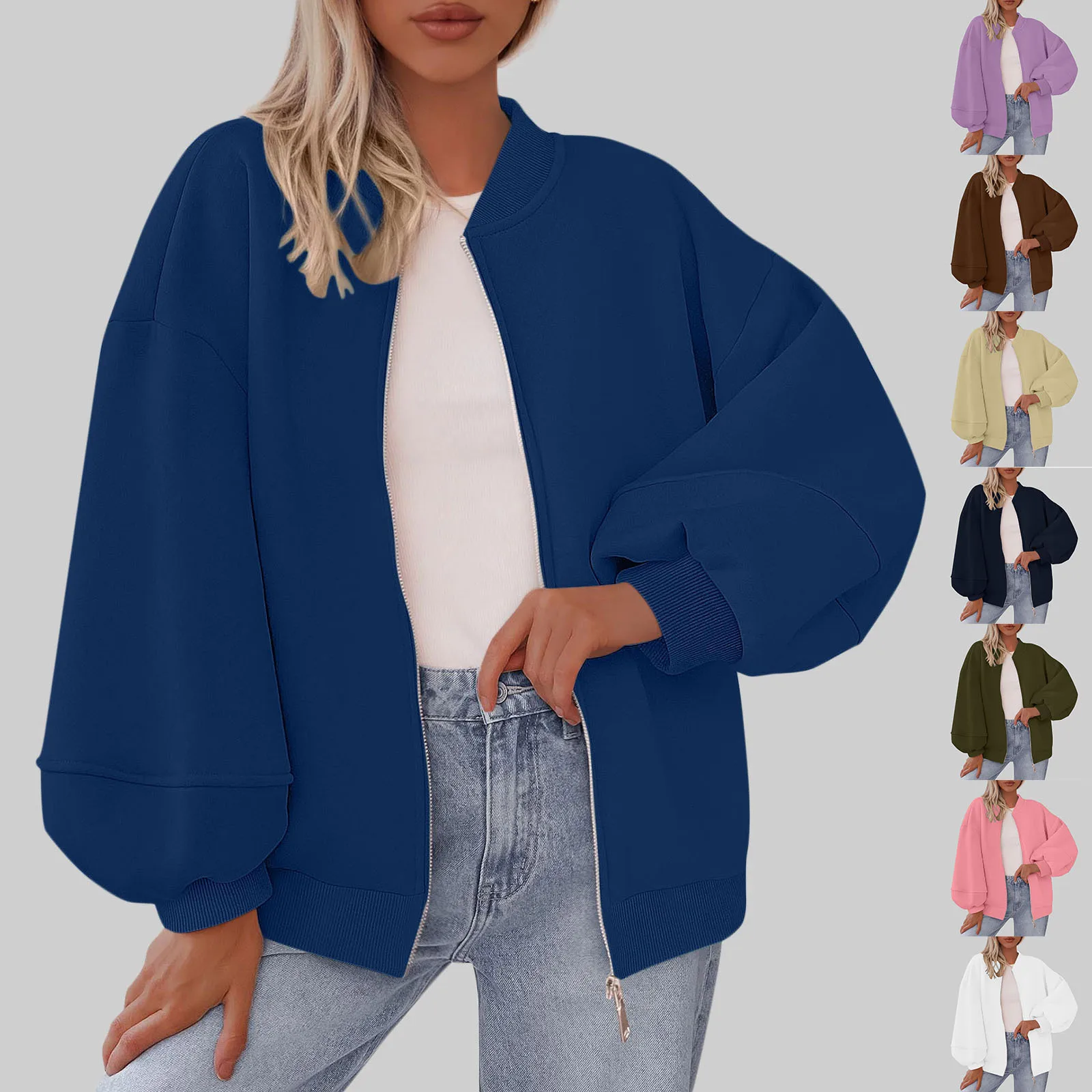 Women's Autumn Winter Zipper Sweatshirt Jacket Casual Long Sleeve Bombr Coat Solid Color Cardigan Outerwear Slim Coats