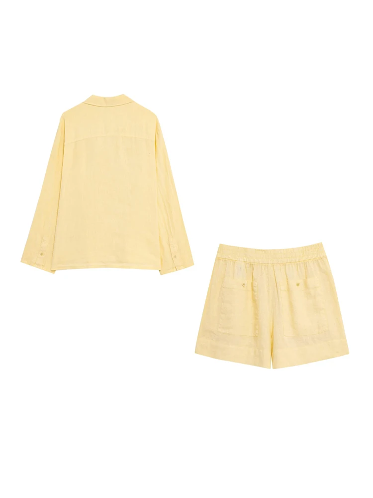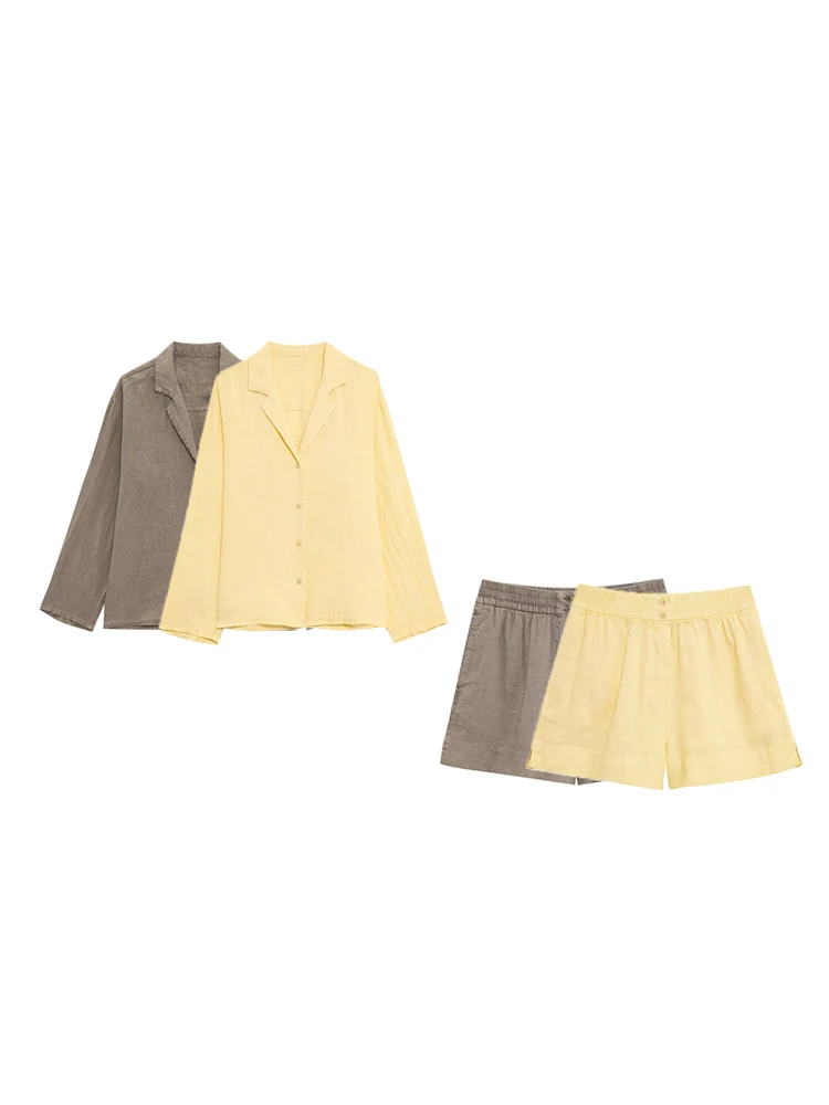 Women's Fashion Button-Up Linen Shirt Set Mid Elastic Waist Side Pockets Two-Piece Outfit for Ladies