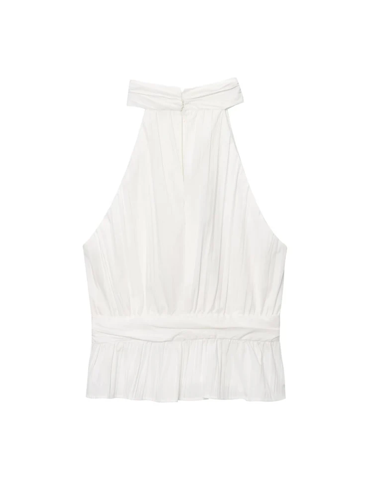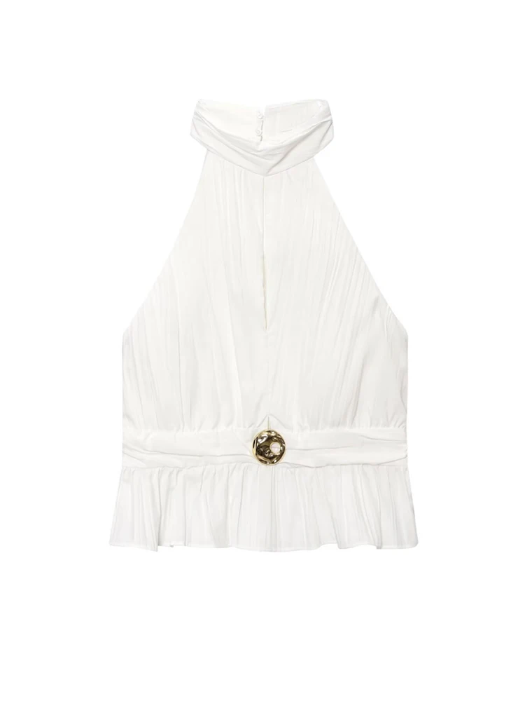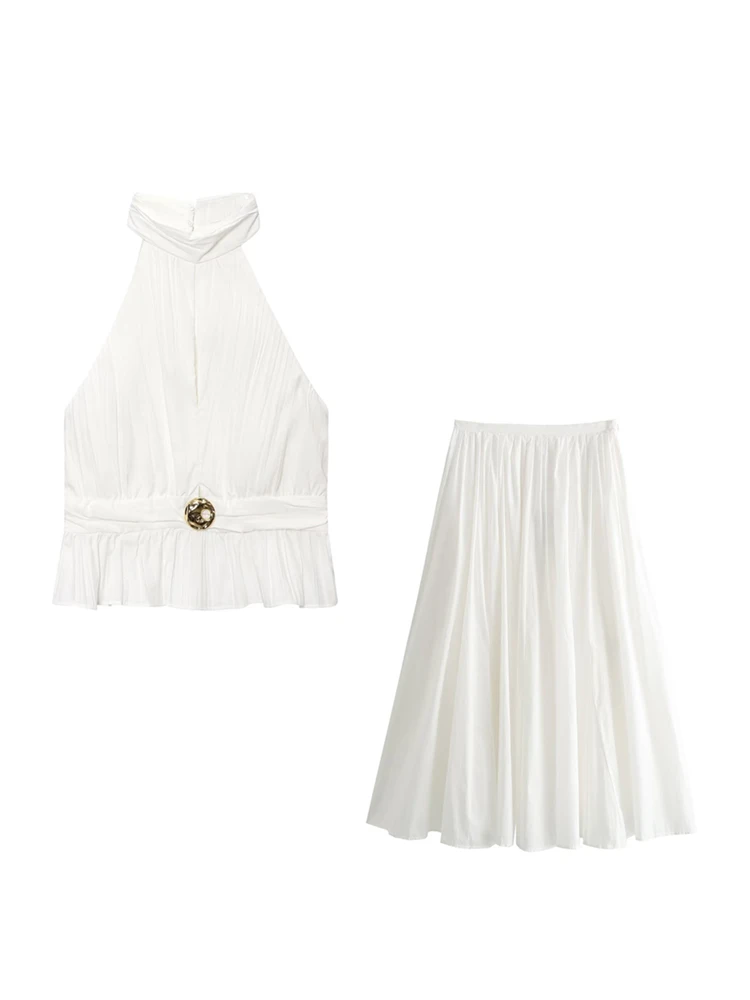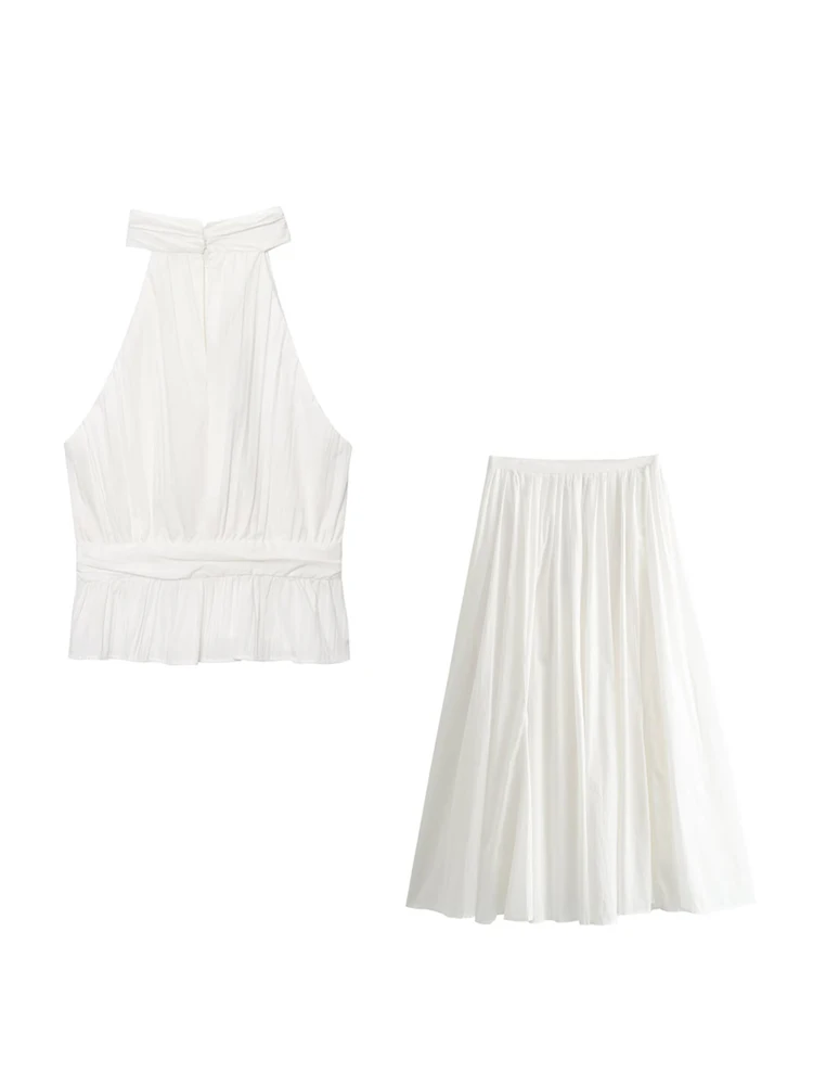Women’s Fashion Front Slit Pleated Halter Top And High Waist Side Zipper Skirt Set Elegant Female Outfit