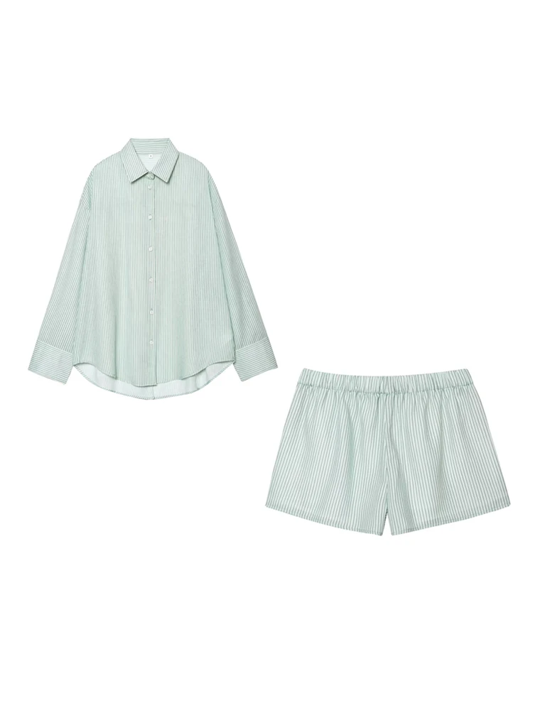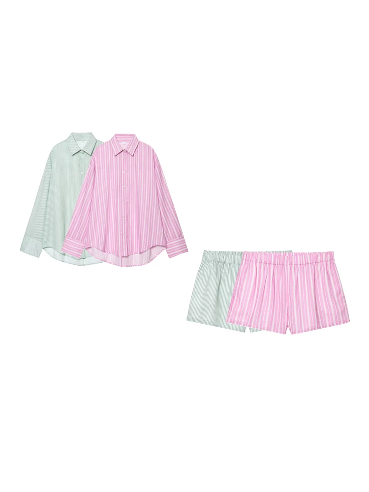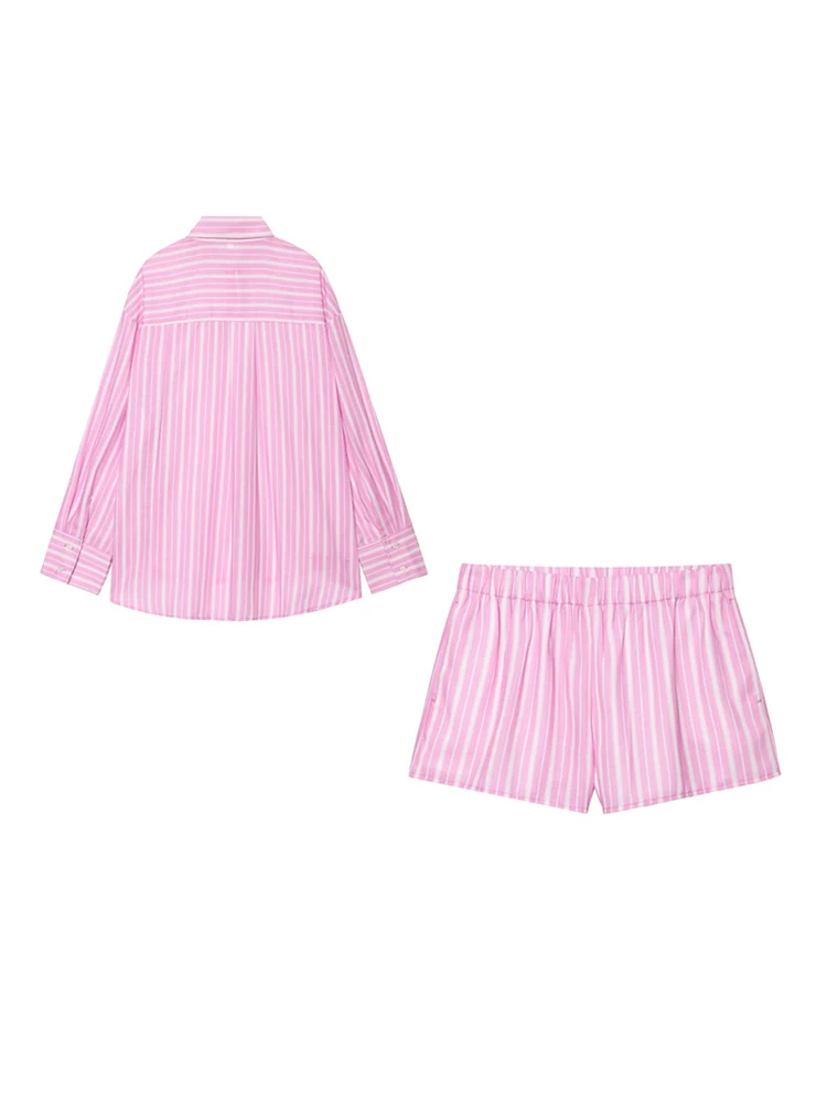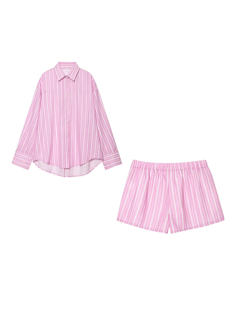 Women’s Fashion Oversized Striped Shirt Set And Mid-Waist Elastic Waist Side Pockets Shorts Female Sets Outfit Mujer