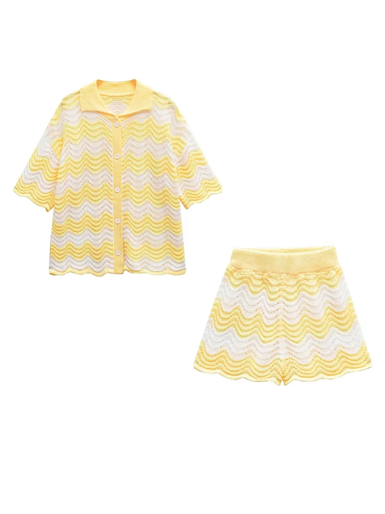 Women's Fashion Striped Loose Knit Cardigan Sweater with Elastic Waist Shorts Two-Piece Set Casual Female Outfit