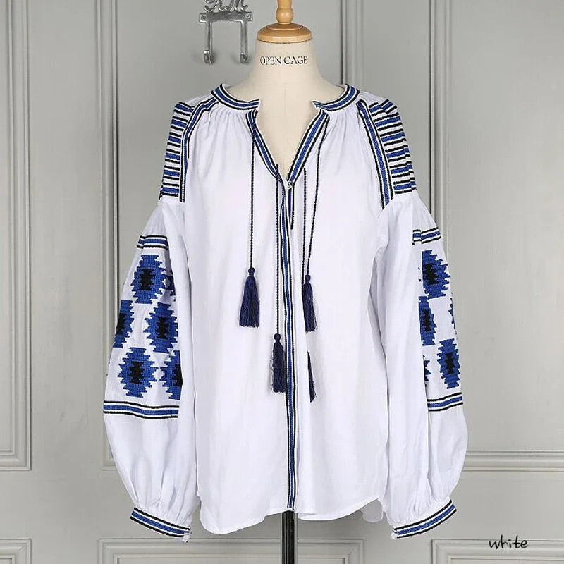 YACKALASI Women cotton floral embroidered blouses tassel lantern sleeve loose Casual hippie women tops blouse and shirt