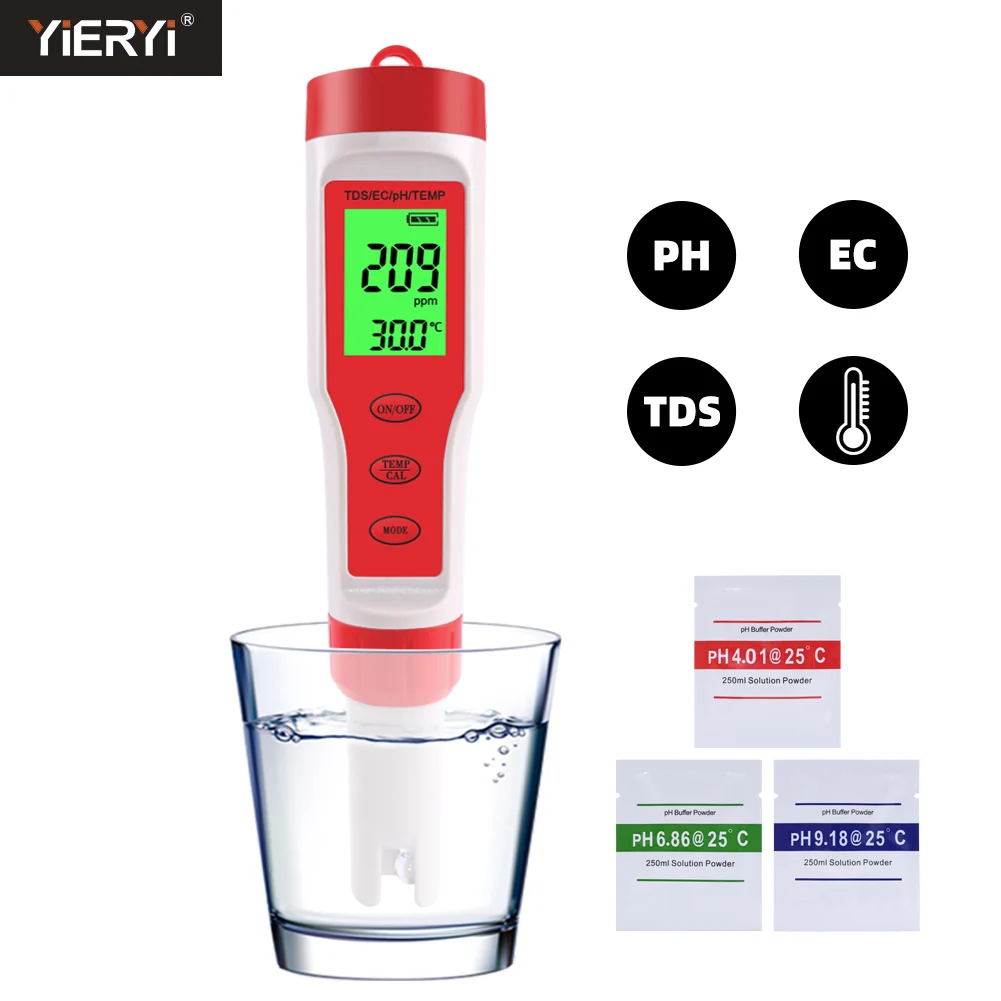 YIERYI 4 in 1 PH/TDS/EC/Temperature Meter Digital Water Quality Monitor Tester for Pools, Drinking Water, Aquariums