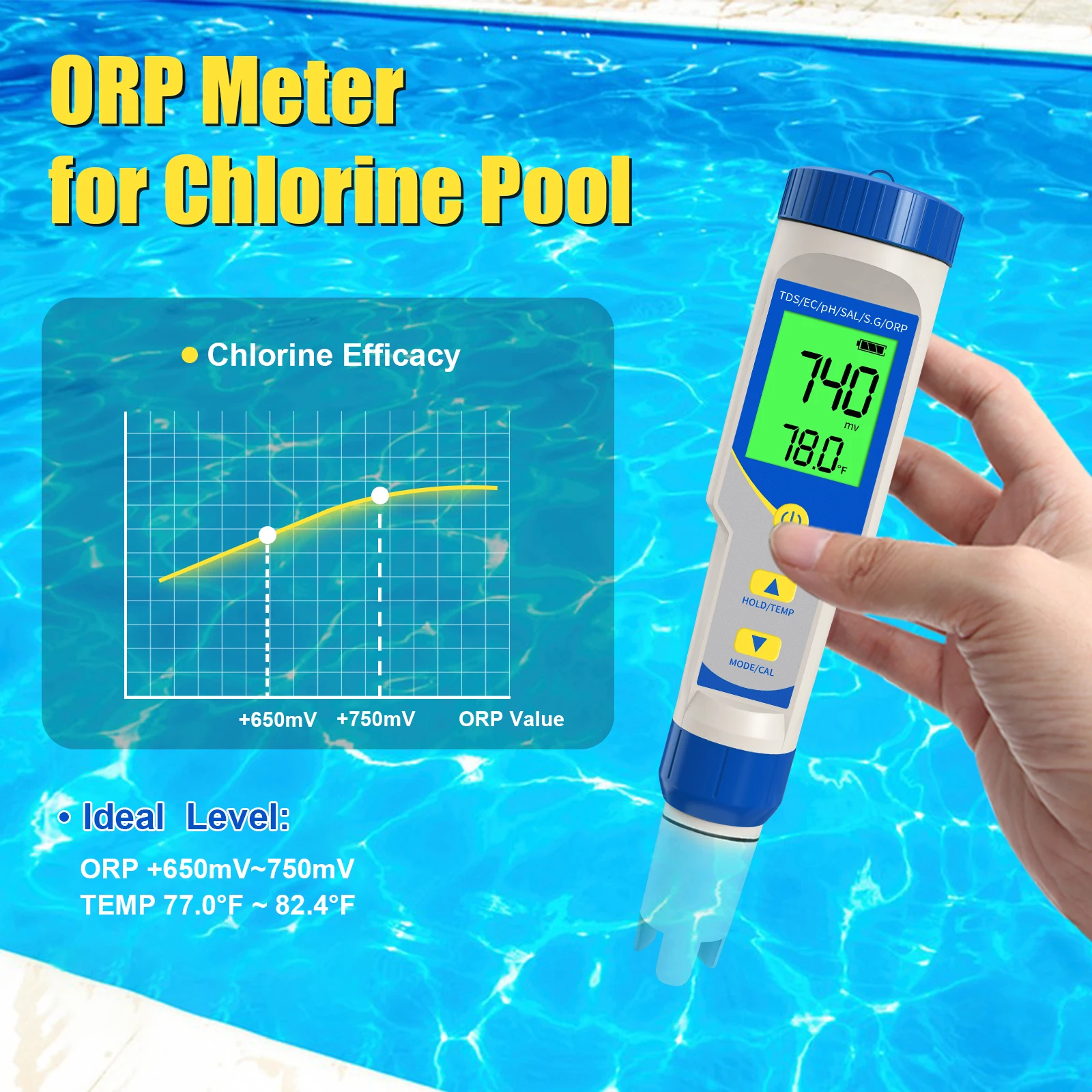 7-in-1 pH Meter: The digital pH meter can measure pH, EC, TDS, salinity, S.G, ORP, and temperature. Effortlessly switch Salt Tester for Saltwater Pool: Salt range: 0.01%-25.00%/0-10000ppm/10.1-200.0ppt; Brand new Yieryi salinity tester can help check the salt level (Ideal level: 2700-3400 ppm) of the saltwater pool and hot tub with salt chlorinator system. Help the salt chlorinator work more efficiently in the appropriate salinity value. This is an excellent tool for all saltwater pool and hot tub owners.