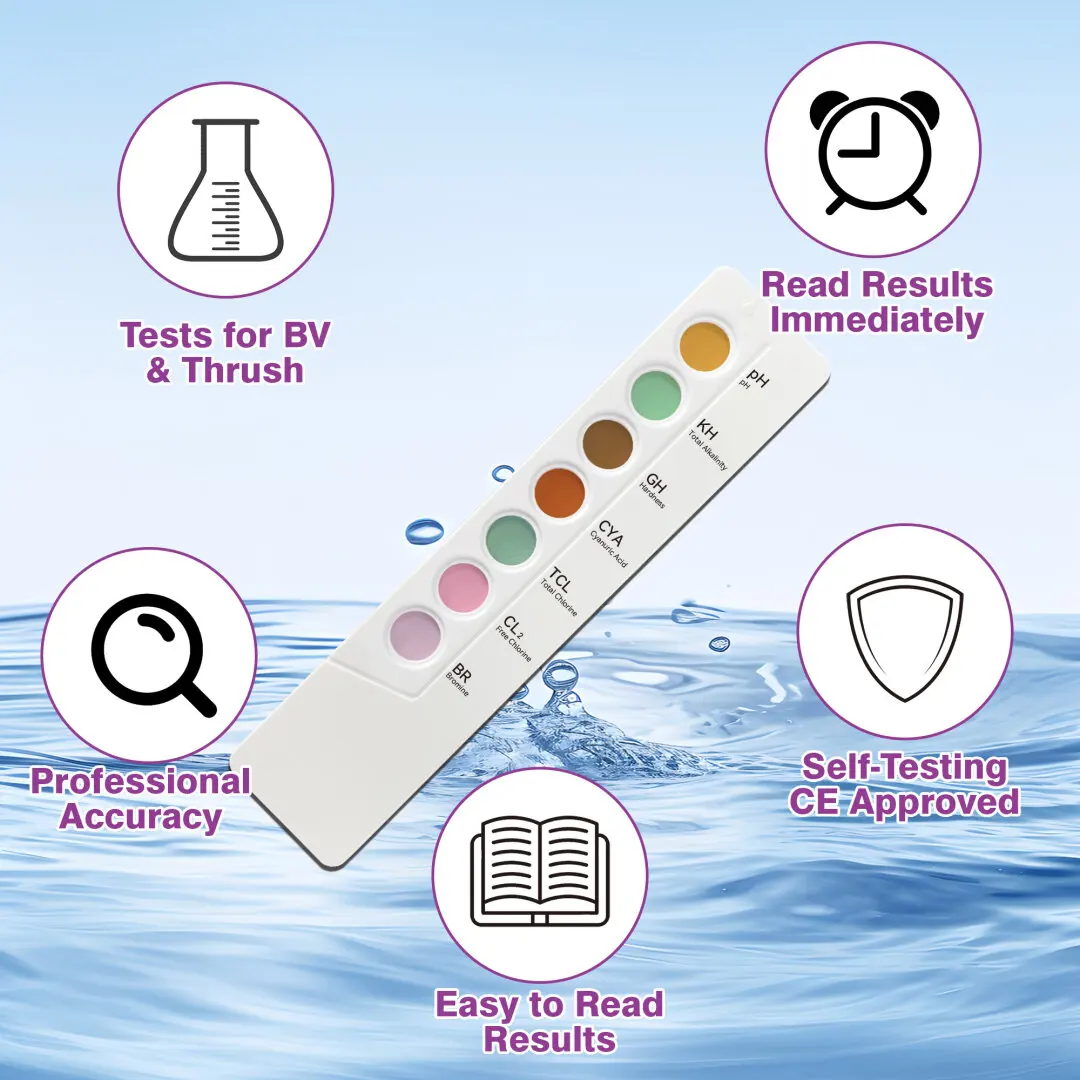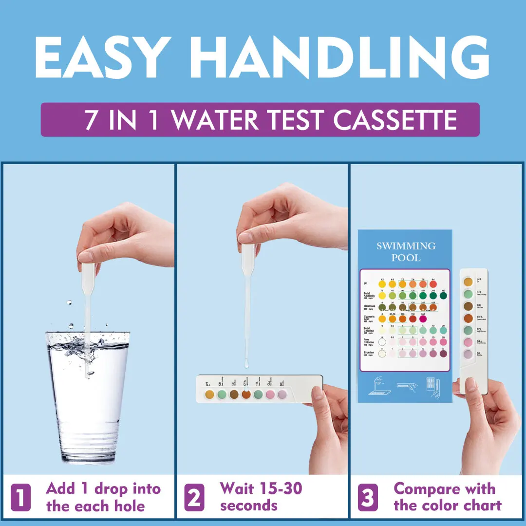 Our 7 in 1 Pool Test Kit offers a simple yet accurate solution for testing 7 key water parameters in swimming pools, spas, aquariums, and fish tanks. Effortlessly measure pH, KH (Total Alkalinity), GH (Hardness), CYA (Cyanuric Acid), TCL (Total Chlorine), CL₂ (Free Chlorine), and BR (Bromine). Perfect for both residential and professional use, it ensures comprehensive water quality monitoring for safe and clean environments.