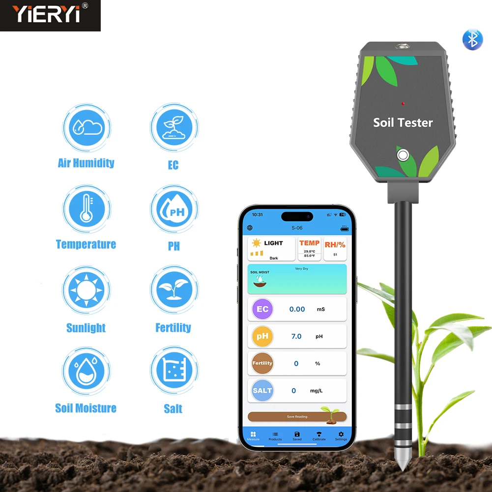 Yieryi 8-in-1 Smart Soil Tester pH/Salt/EC/Fertility/Temp Bluetooth APP Data Logger Soil Moisture PH Meter for Garden Planting