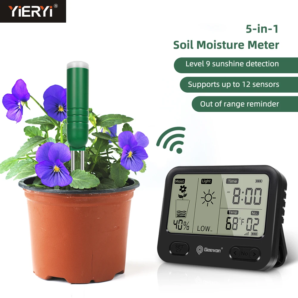 Yieryi Wireless Soil Moisture Sensor 5 in 1 Temp/Sunlight/Time/Soil Hygrometer with Indoor Digital LCD Monitor for Garden Plant